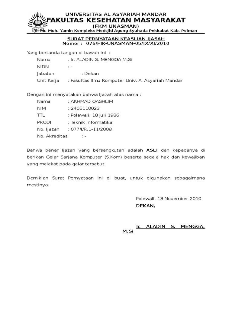 Contoh Surat Keterangan Keaslian Ijazah Dari Universitas Bagi Contoh Surat