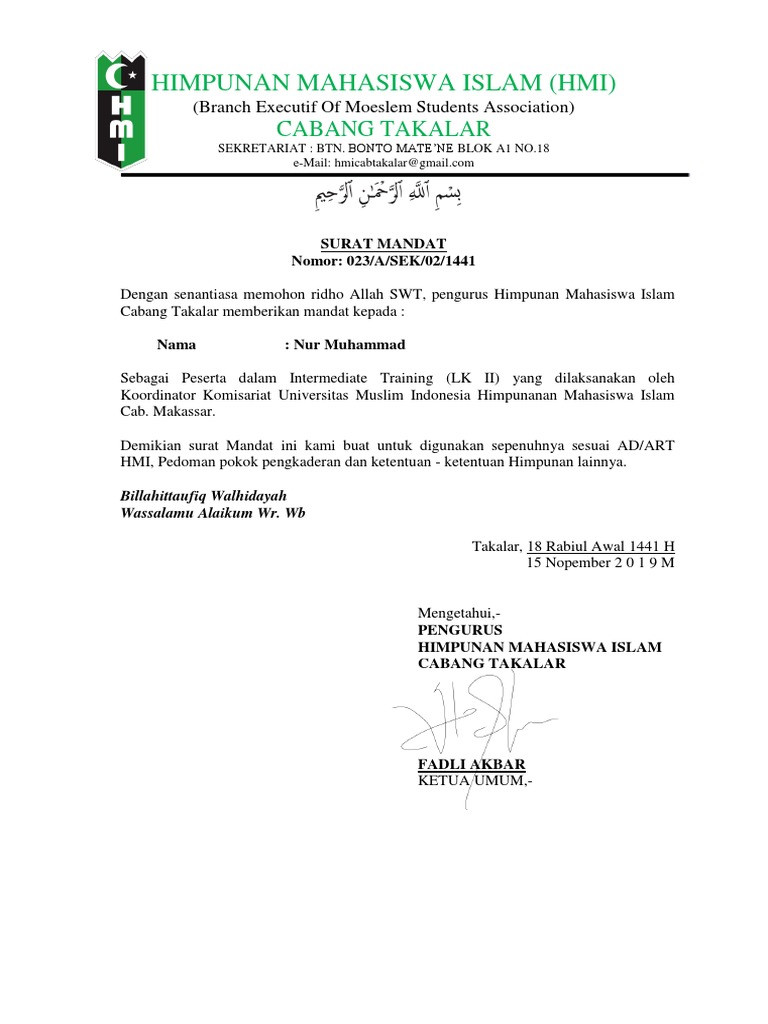 Surat Mandat Lk 2 Himpunan Mahasiswa Islam Hmi